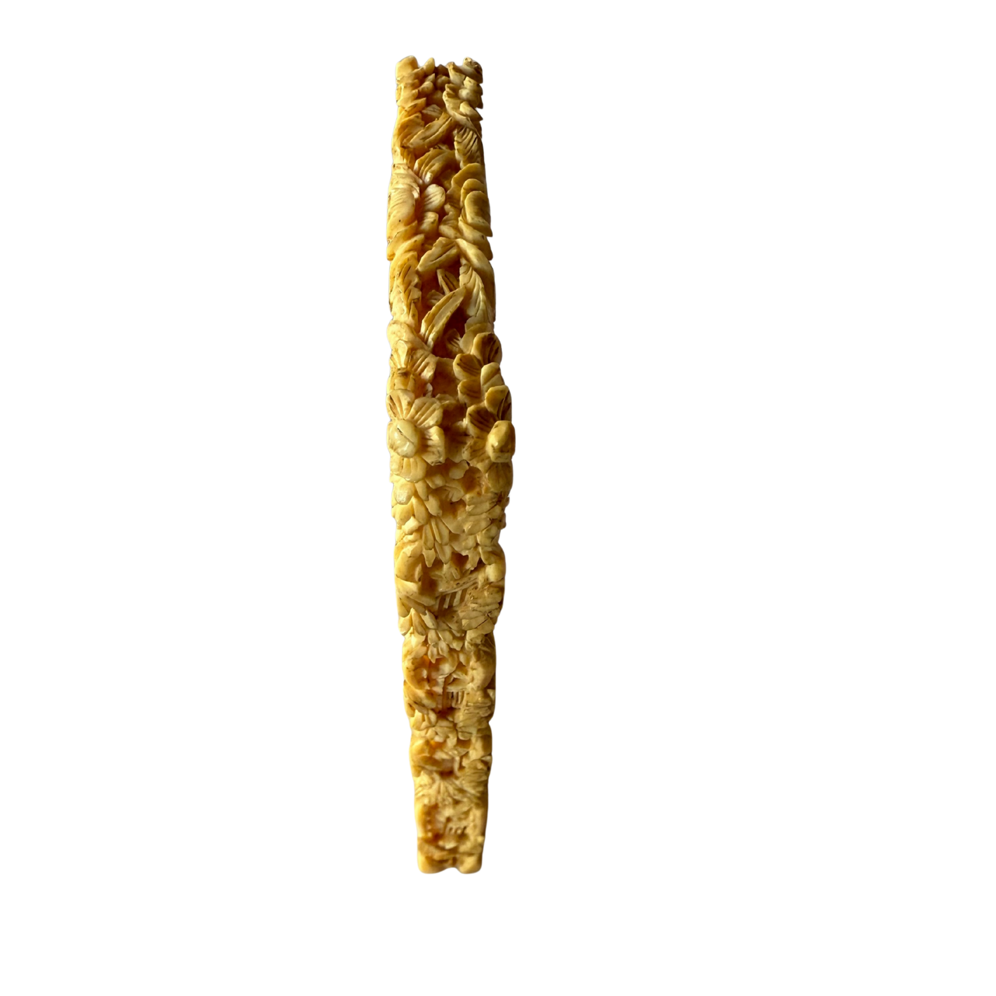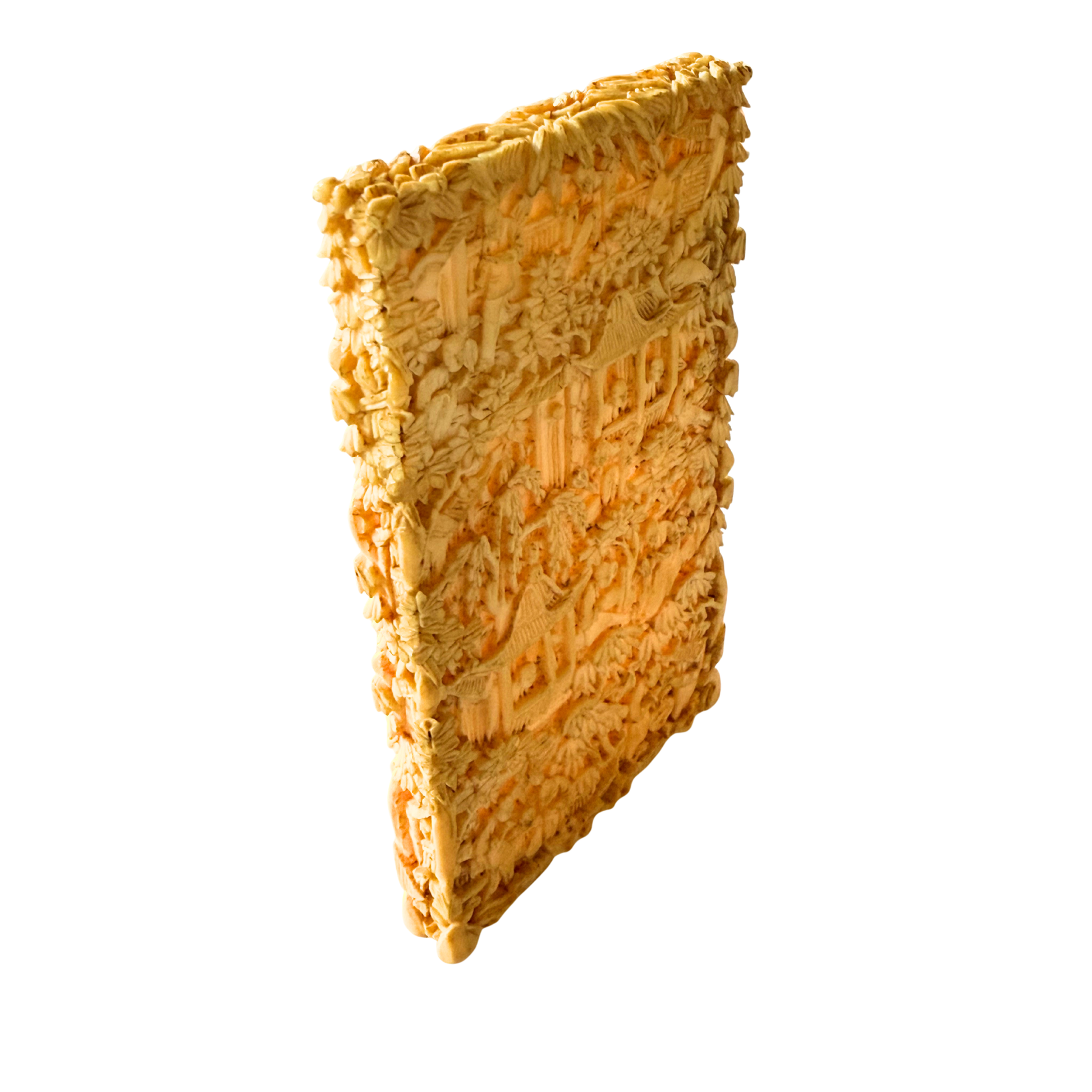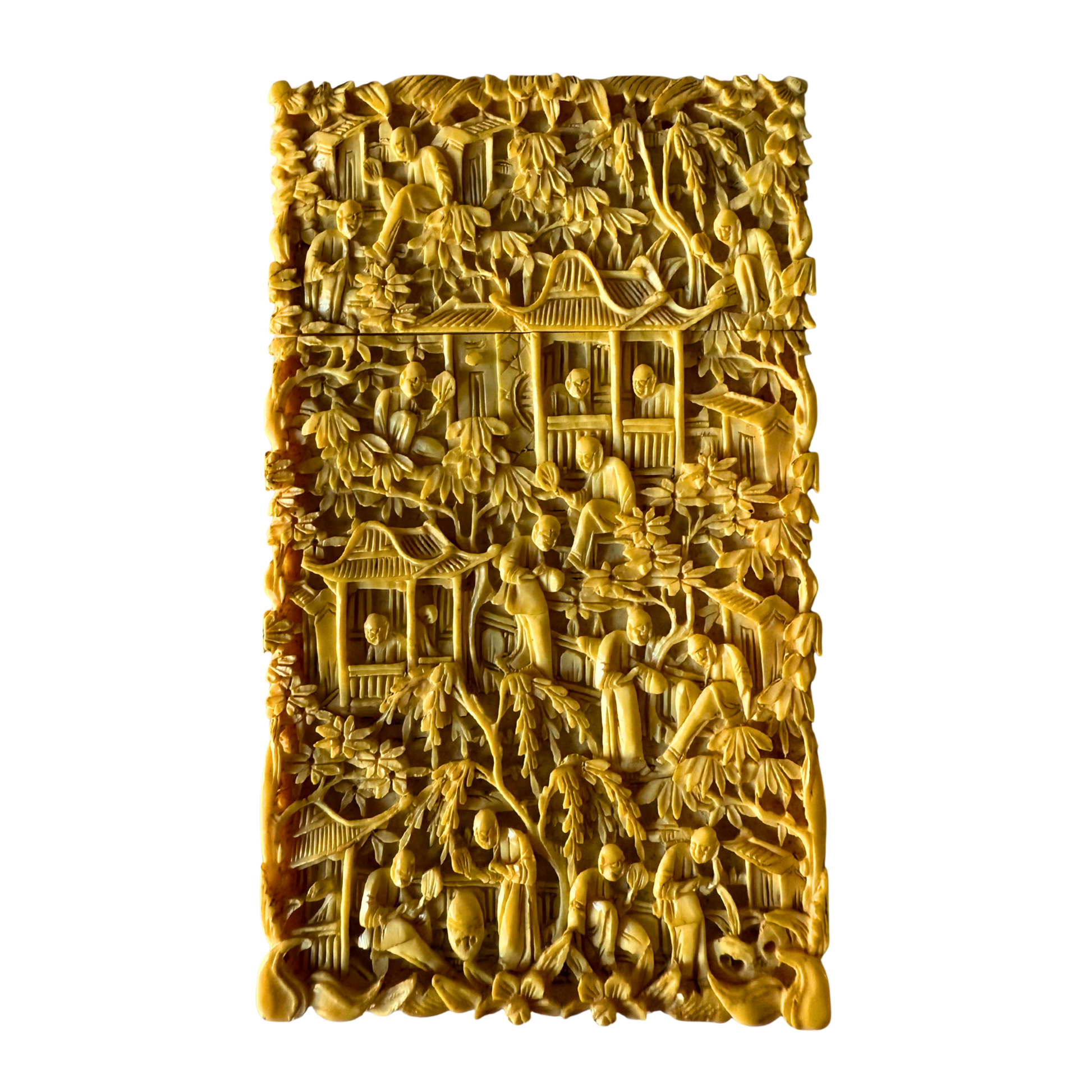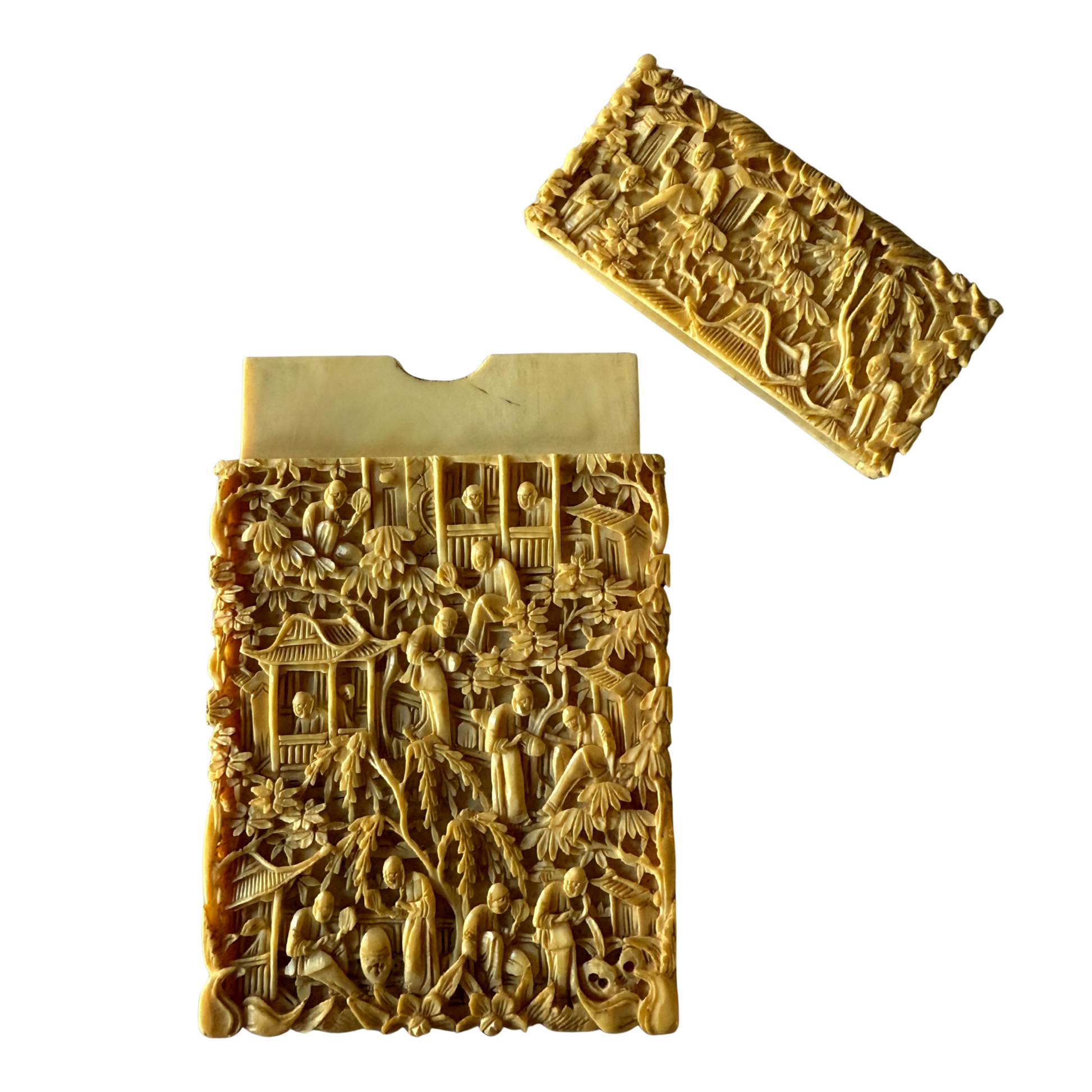 A finely carved antique Chinese scholar’s card case featuring an intricate garden scene with figures, pavilions, and layered foliage. Objects of this type were used to hold visiting cards or small documents and were associated with the cultured life of the Chinese literati during the late Qing dynasty.
