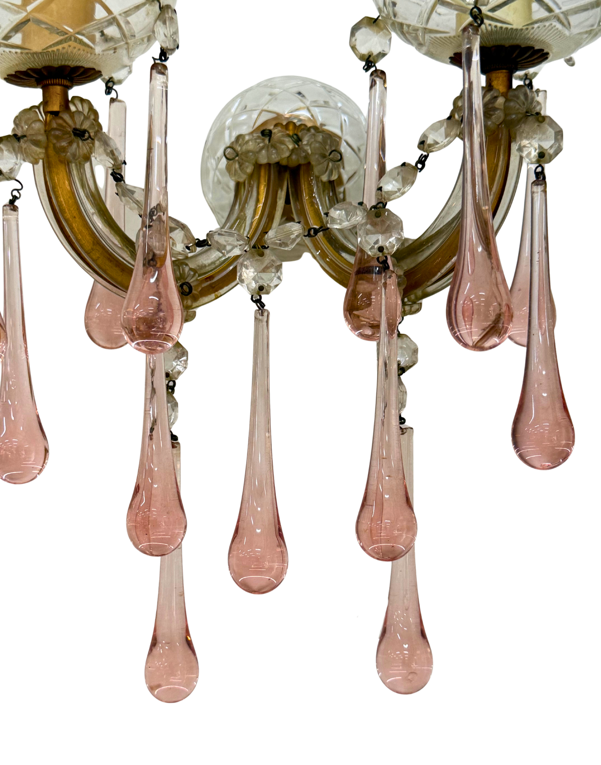 This exquisite vintage wall sconce is a stunning example of mid-century French lighting design, crafted in France from gilt metal and hand-blown glass. Featuring a graceful double-arm silhouette, each sconce is adorned with apricot-pink glass teardrop prisms, clear faceted garlands, and cut-glass bobeches etched in a classic crosshatch pattern. The arms are encased in clear glass tubing, with delicate flower-shaped connectors adding even more charm and texture.